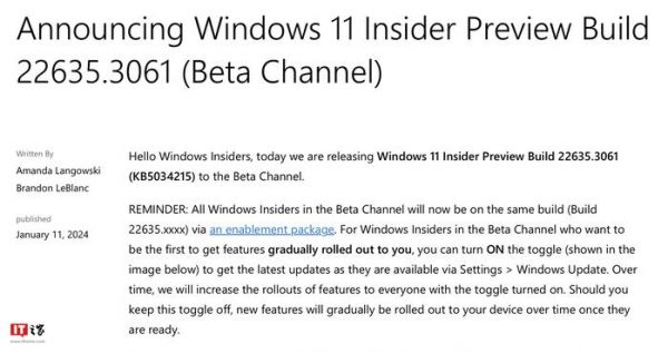 IT之家 1 月 12 日消息,微软今日面向 Windows 11 Beta 预览版用户推送了 22635.3061(KB5034215)更新, 本次更新主要改进了共享菜单、锁屏天气及微软商店。