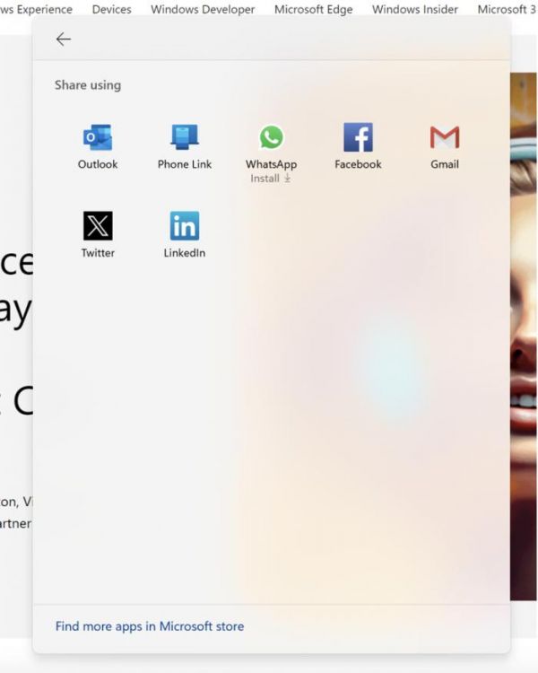 Windows 共享窗口现在支持共享文件 Url 内容至 WhatsApp、Gmail、X 平台、FaceBook、领英。用户可以在 Edge 浏览器的工具栏中找到相关共享窗口。
