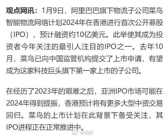 据观点网消息,菜鸟计划2024年在香港进行首次公开募股(IPO),目前正在稳步推进中,并最快有望在一季度完成挂牌,预计融资达10亿美元。