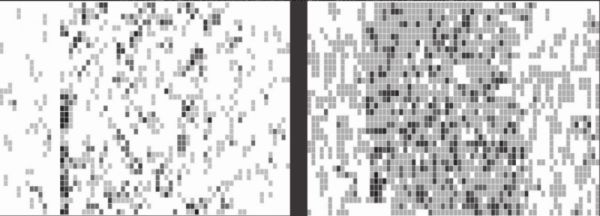 图 1 为一台 1970 年代的双鸽牌机械式中文打字机。新中国普遍使用的正是这种活字的打字机。如果遇到没有的字,一般是手写补充。图 2 为一种“预测文本”编排形式。整个字盘一般有 2450 个字,都以类似关联方式编排,也可以根据个人习惯和打字需求随时调整。图 3 为两张字盘的热图对比,一张来自民国时期(左),一张来自自然语言编排运动之后(右)。每个方格颜色越深,表示该汉字与毗邻汉字组词的数量越多(从 0 到 8)。图 1 来自 wikiwand,图 2 和图 3 来自《中文打字机》。