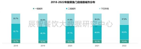 从过去三年的数据来看,一二线城市仍是酸菜鱼品牌的主要竞争点,下沉市场依旧潜藏巨大机会。2022年,酸菜鱼在一二线城市的门店占比总和约62.2%,而下沉市场的占比为37.8%。