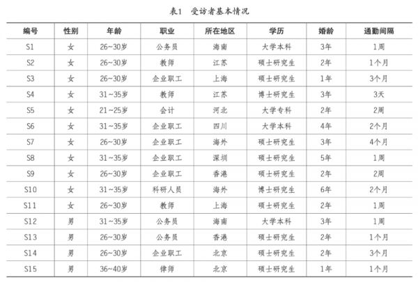 基于以上背景,本研究希望通过深度访谈探究通勤婚姻中夫妻双方如何塑造远距离的亲密关系和协商家庭生活。本研究的创新价值体现在:第一,国内对异地而居的婚姻模式中女性的研究较多关注母亲而非妻子的角色,既有研究多集中在城市—乡村流动背景下的婚姻模式,对都市中青年通勤婚姻群体的关注较少,也几乎没有对这一群体的生活经验与婚姻关系的深描;第二,本研究希望关注流动背景下青年夫妻的情感沟通与生活协商的方式与过程,并由此探讨通勤婚姻的去传统化与再传统化特征。