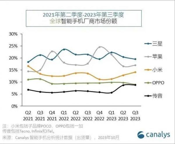 从2023年Q3的市场份额看,全球前四大手机厂商的排名不变,依次是三星、 苹果、小米、OPPO。另外,中国手机厂商传音份额上升到9%,全球排名第五。