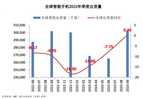 好在,相比上一年,下滑趋势收窄。IDC数据显示,2023年Q1到Q3,全球智能手机出货量依次为2.69亿部、2.65亿部和3.03亿部,同比增速分别是-14.6%、-7.8%和0.3%。