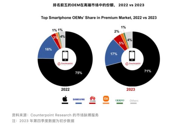 苹果是无可争议的高端市场老大哥,但2023年的份额比上一年下降了4个百分点。“瓜分者”除了三星,还有华为、小米,后两者的份额分别增加到5%、2%。