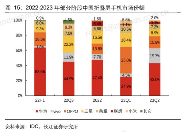 折叠屏目前在全球范围内尚处于市场教育阶段,不过,在国内市场发展较快。据IDC数据,2023年Q2中国折叠屏手机出货量约126万台,同比增长173%,环比增长24%。