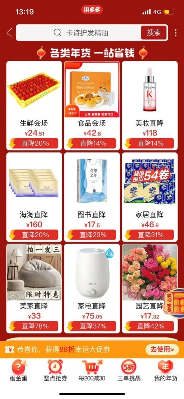 在拼多多客户端搜索“年货节”即可点击进入大促主会场。进入会场后,可领取优惠券,也有机会获得288元大促券,此外,会场内设置砸金蛋、三单挑战、整点抢券等活动。