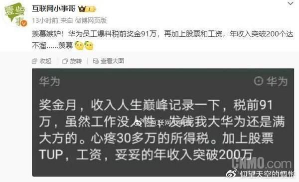 2023年,在手机业务重回正轨的背景下,华为全年营收实现了不错的增长。不难想象的是,这一增长也会反映到华为员工的收入上。据CNMO了解,网上有疑似华为员工爆料,自己税前奖金达到了91万,再加上股票和工资,年收入突破200万元。