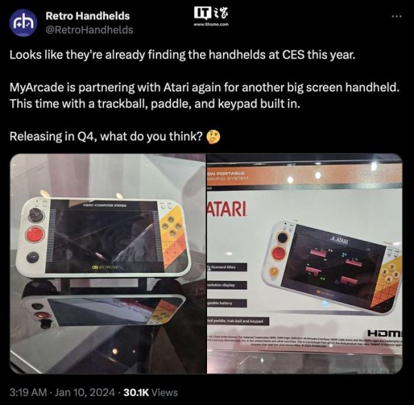 IT之家 1 月 15 日消息,据外媒 Retro Handhelds 报道,雅达利日前在 CES 2024 中展示了一款名为“Game Station Portable”的 7 英寸便携式游戏掌机,该掌机主打雅达利复古游戏,售价 149 美元(IT之家备注:当前约 1070 元人民币),预计将在今年第四季度发售。