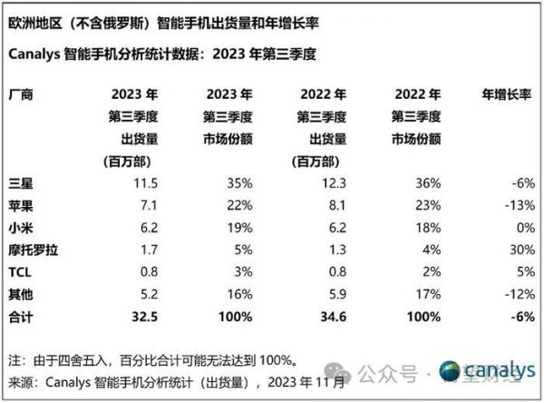 Canalys数据显示,2023年第三季度,欧洲(不含俄罗斯)智能手机出货量为3200万部,三星、苹果出货量大跌,小米以19%的市场份额位居第三,联想集团旗下摩托罗拉出货量逆势增长30%,并以5%的份额跻身第四;TCL出货量同比增长5%,并以3%的份额排名第五。