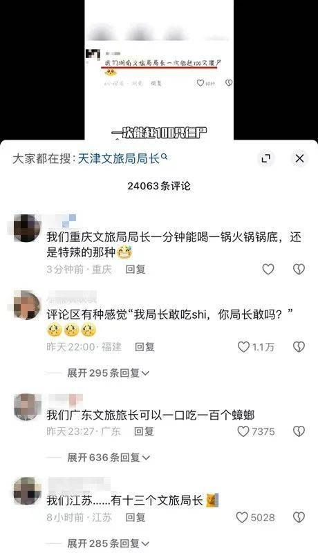 其中有不服气的重庆网友表示自家文旅局长能“一分钟喝一锅火锅锅底,还是特辣那种”,广西网友则表示自家文旅局长能“一天剪5吨沙糖桔”;