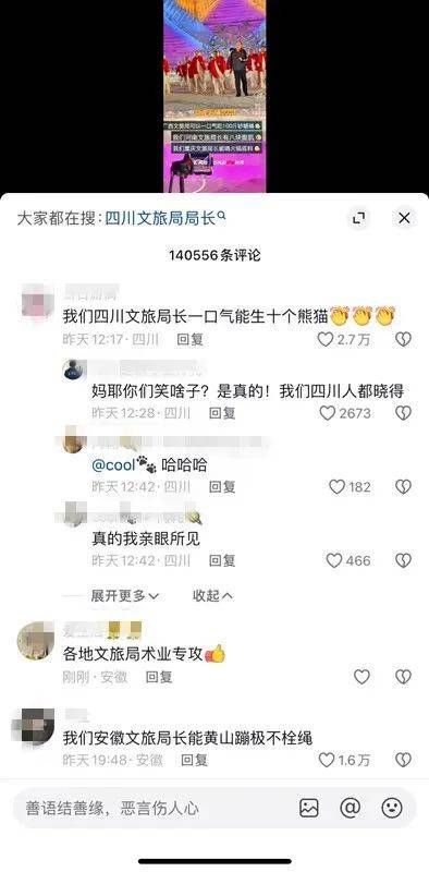更有四川网友直接放出大招,称四川文旅局长能“一口气生十个熊猫”;安徽网友则说自家文旅局长更厉害,能“黄山蹦极不拴绳”……主打一个为了游客“啥都能整”,看的一众文旅局长们也是“汗流浃背”不吱声。