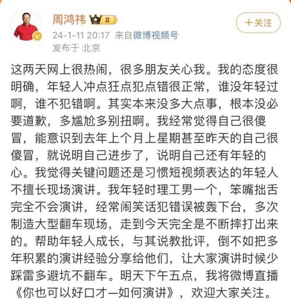 在程前公开道歉后,周鸿祎发文表示,“年轻人犯错很正常,与其说教批评,倒不如把多年积累的演讲经验分享给他们”,顺便预告了自己的直播公开课《你也可以好口才—如何演讲》。