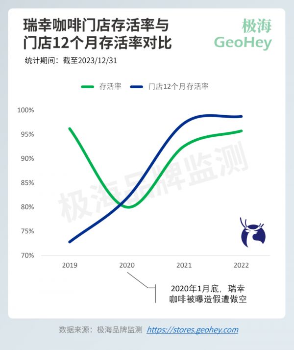 这里的关键在于,瑞幸咖啡是在2020年1月底被曝造假做空的,随之而来的是大规模的关店,所以2020年的存活率(绿色线条)一下子降到了80%。