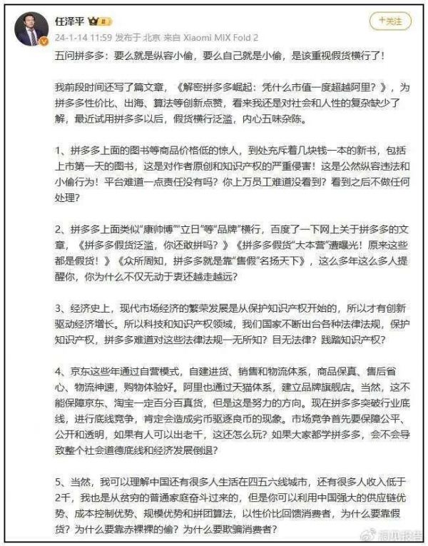 1月14日,经济学家任泽平在社交平台发文,“五问”拼多多平台假货横行,要么就是纵容小偷,要么自己就是小偷。他举例称,拼多多上的图书等商品价格低得惊人,对作者原创和知识产权造成严重侵害。同时,类似“康帅博”、“立日”等品牌也在平台上横行。