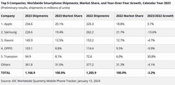 IDC公布的数据显示,2023年Q4,全球手机出货量3.261亿台,同比增长8.5%。其中,苹果出货量8050万台,市场份额24.7%,同比增长11.6%;三星出货量5300万台,市场份额16.3%,同比下滑10.9%;小米出货量4070万台,市场份额12.5%,同比增长22.7%;传音出货量2820万台,市场份额8.6%,同比增长68.6%;vivo出货量2410万台,市场份额7.4%,同比增长5.1%。