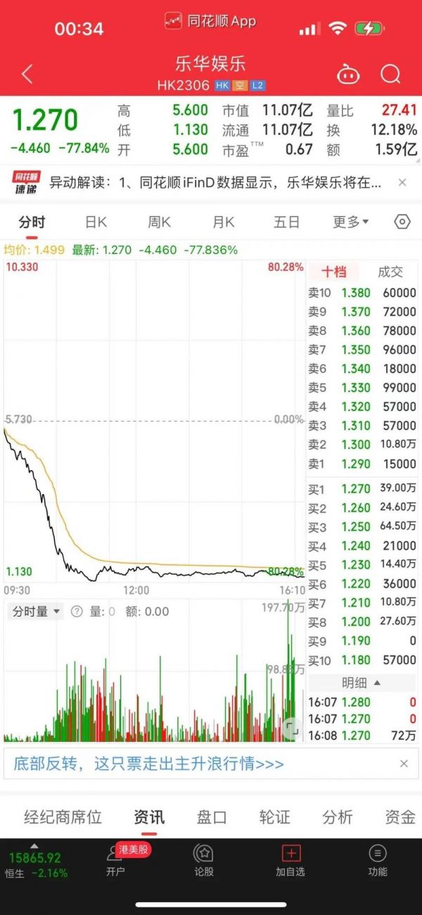 从收盘数据来看,经历了如此的极端波动,乐华娱乐的资金进出量级并不算大:当日成交1.06亿股,成交额1.59亿港元,换手率为12.18%,放在A股大盘里,这个换手比率只能算是较为活跃。