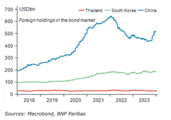 在亚洲市场,外国投资者在中国债券市场的头寸最大 数据来源:法国巴黎银行
