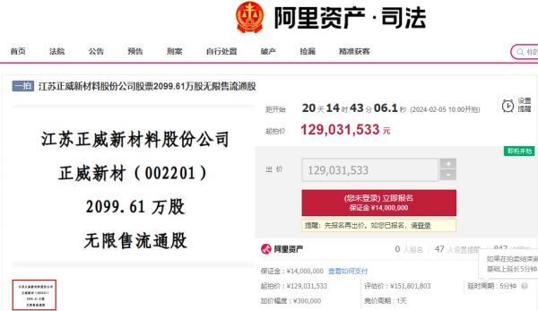 此外,正威集团也面临着资产拍卖的窘境。据阿里司法拍卖网信息,今年2月5日~6日,正威新材(002201.SZ)2099.61万股将被司法拍卖,第一次拍卖的起拍价约为1.29亿元,拍卖保证金为1400万元,增价幅度为30万元。