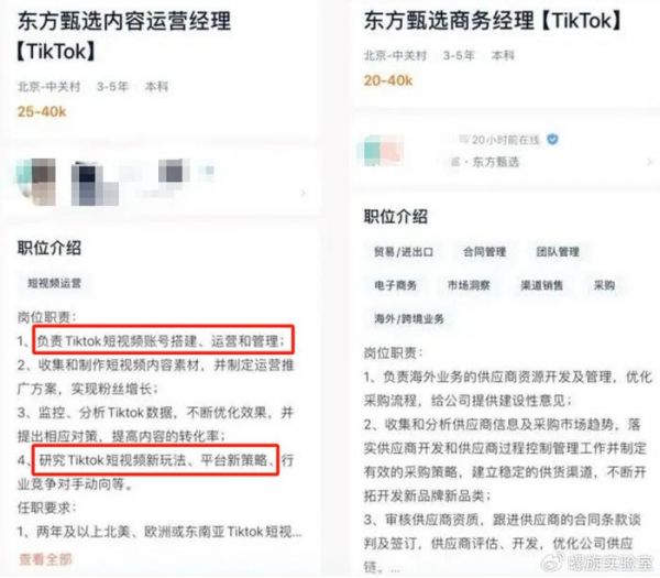 东方甄选也在今年加紧了出海的步伐,根据多家媒体报道,东方甄选目前在大量招聘TikTok方向的直播人才,岗位类型包括内容运营、商务等。
