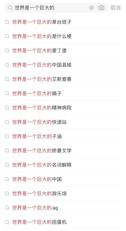 随后,“世界是一个巨大的XX”这一句式又有了各种变体:世界是一个巨大的娟子、世界是一个巨大的中国县城、世界是一个巨大恋爱脑、世界是一个巨大的复读机......