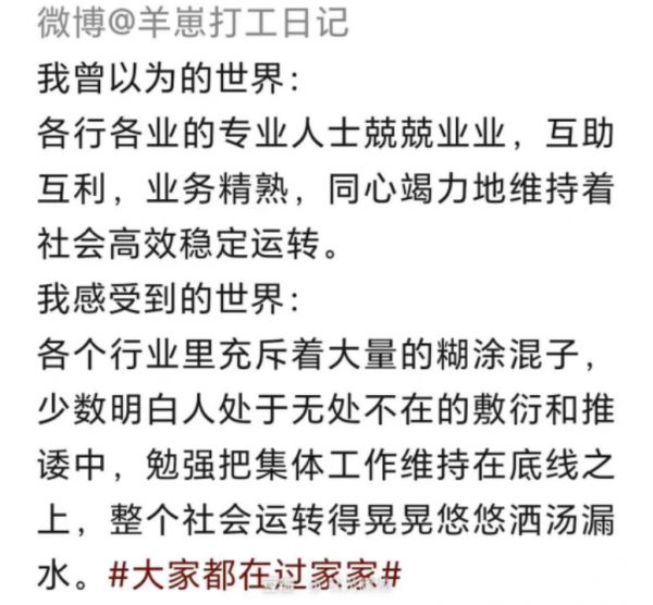 在网友关于“世界是个草台班子”的评论里,有不少表露的是在入职前后的心理落差。进了众人仰慕的大厂之后,发现大家都是在做无用的螺丝钉;在各大CBD高楼里西装革履的都市丽人,原来是经常熬夜加班的都市“隶”人;看起来精通专业知识的职场精英,原来是“正在懂”。