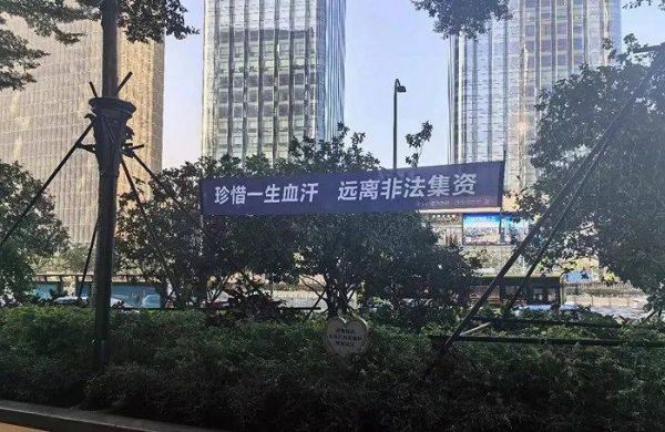 1月16日下午,界面新闻记者来到滨河时代大厦A座楼下,看到沙头街道办事处联合沙头派出所挂出的一个横幅,上面写着“珍惜一生血汗 远离非法集资”。但此类警示似乎并没有起到什么作用,在红树湾壹号A座6楼,一场最新的鼎益丰投资宣讲会正在深圳市紫腾文化有限公司(下称“紫腾文化”)的会议室进行。
