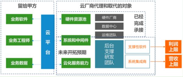 硬件服务器、数据中心、操作系统、网络设备、运维团队、数据库、消息队列、对象存储、反向代理、RTMP流媒体服务、系统架构师,这些工作都是云厂商代理和取代的对象。这些工作是客户开展IT业务的必备花销,所以收入总规模极大,但这些工作和客户的业务逻辑无关,所以可以抽象合并成云产品。