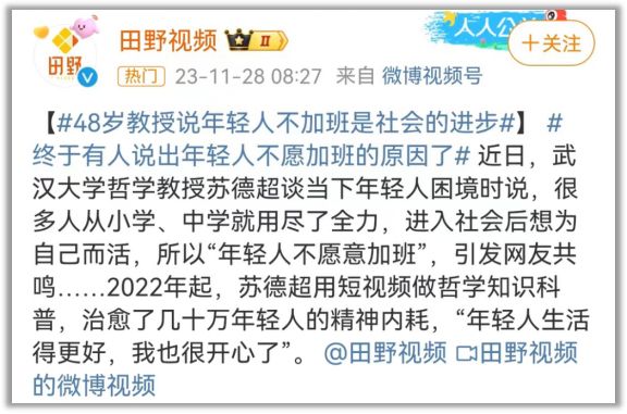 武汉大学的苏德超教授也认为,年轻人不愿意加班说明社会进步了。