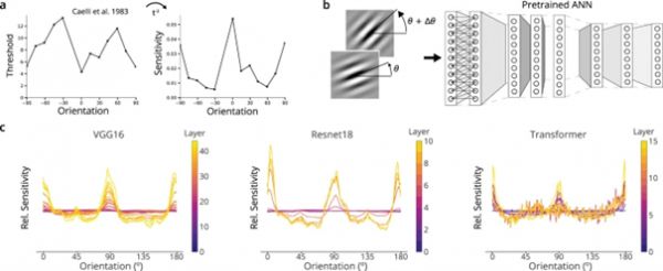 为了搞清楚这一现象究竟从何而来,研究者[1]基于卷积神经网络的模型VGG16及 Resnet18,以及非卷积网络架构的transformer,分别构建人工神经网络,来模拟这一现象。他们发现,经过训练的网络在对不同方向的刺激进行处理时,显示出与人脑类似的倾斜效应。具体来说,这些网络在0度、90度和180度的方向刺激上的反应更为敏感。这是我们首次观察到人工神经网络和大脑涌现出相同的特征,而这一主题将在之后反复出现。