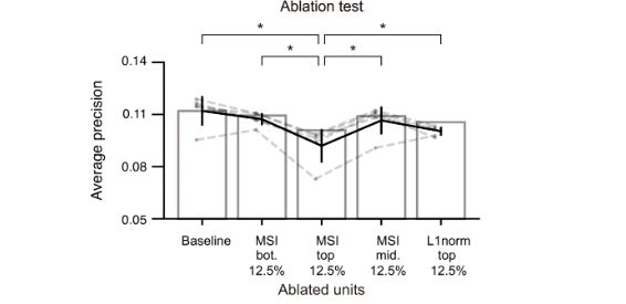 ▷图6:音乐选择性MSI最高的12.5%人工神经网络单元抹去后,对该网络分类准确性的影响最大。来源:参考文献14