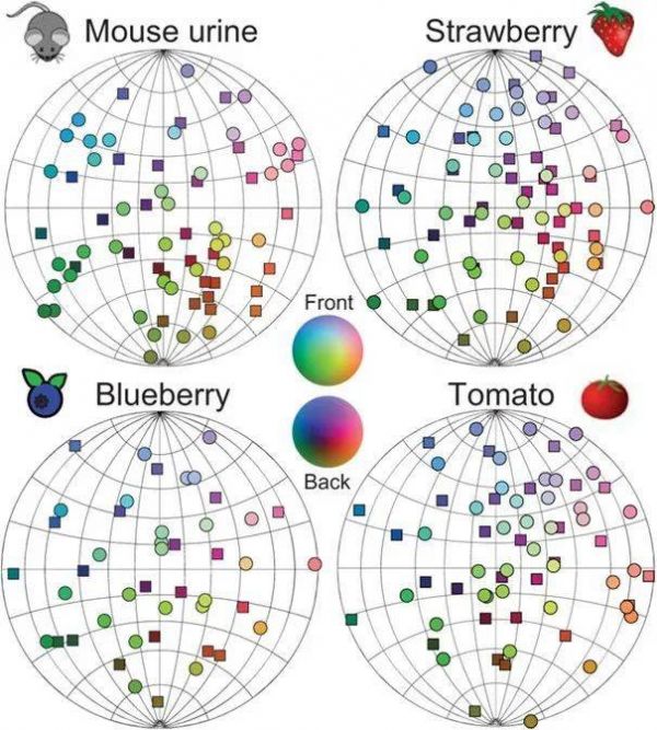 ▷图8:不同物体对应的嗅觉地图,圆形/矩形表示近/远侧。来源:参考文献16