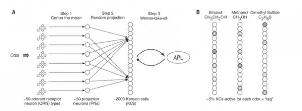 在实验中,图7A中的50个气味分子对应了果蝇的50个投射神经元,图7B中的每个分子,可被看成对应一个长度50的向量。来自投射神经元的信息多对一地到达名为Kenyon细胞处理中心。这个系统采用了一种“赢者通吃”的机制,即在众多神经元中,只有对特定气味反应最强的那个会被激活。
