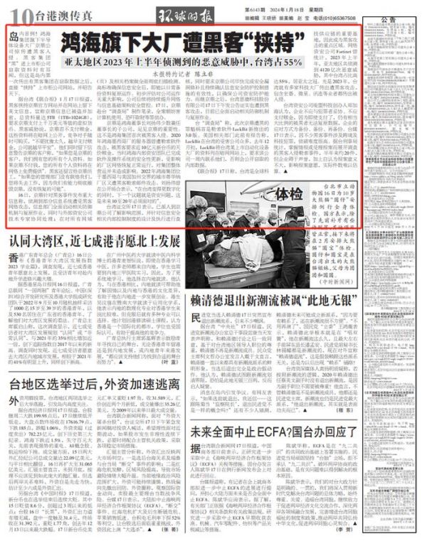 《联合报》17日称,台湾是全球科技供应链的重要基地,因此成为黑客攻击的重点区域。网络资安公司Fortinet曾统计,2023年上半年,亚太地区共侦测到4120亿次恶意威胁,其中台湾占比高达55%,居亚太之冠。光是2023年,台湾就有多家科技大厂传出遭黑客攻击,包含宏碁、微星、讯连等业者都传出被入侵。