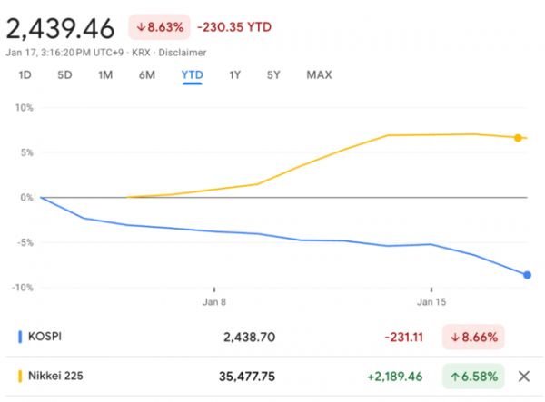 韩国KOSPI指数在最高达到2675.8点后,连跌8天,在第9个交易日小幅反弹之后,最近两个交易日再次下挫,截至1月17日年内累计跌幅超过8.6%,报2435.90点。