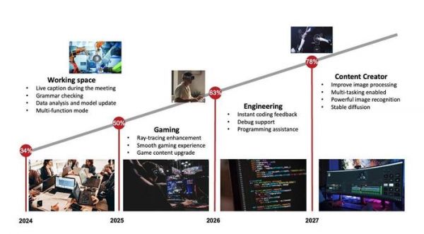 该机构预估 2025 年人工智能笔记本电脑的销售份额将达到 50%,除了主要的 CPU 和 GPU 外,PC 中还将至少配备一个 NPU 或人工智能加速器(人工智能引擎)。