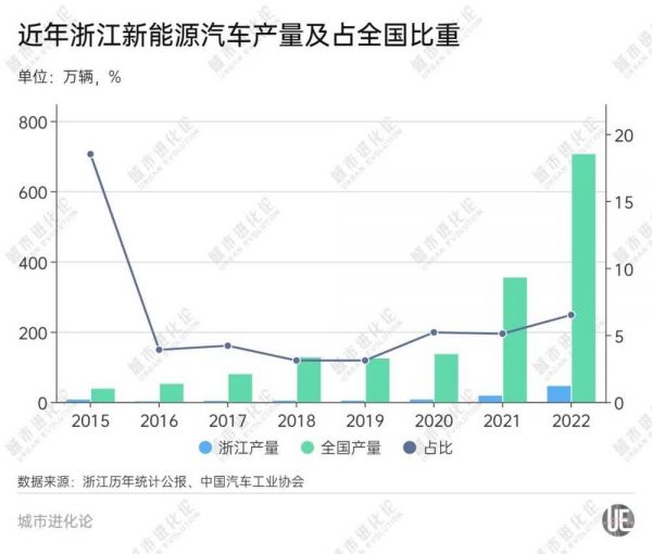 彼时,全国新能源汽车产量才37.9万辆,浙江一省份额就接近五分之一,并形成了较为完备的新能源汽车产业链。