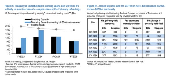 摩根大通直言,尽管美联储放缓缩表不会改变美国财政部的发债脚步,但在市场上可流通的、由私人持有的国债数量将会相应减少: