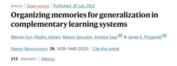 [1] Sun, W., Advani, M., Spruston, N. et al. Organizing memories for generalization in complementary learning systems. Nat Neurosci 26, 1438–1448 (2023).