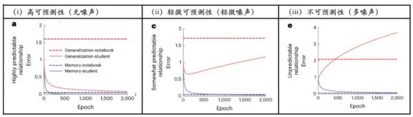▷图5:在优化概括的表现时,学生概括错误、学生记忆错误、笔记本概括错误和笔记本记忆错误的动态变化。(b)高可预测性(无噪声);(d)轻微可预测性(轻微噪声);(f)不可预测性(多噪声)。图源:参考文献1