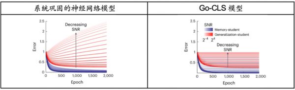 研究人员将上述两个模型进行比较,发现两者在处理不同预测性教师数据时表现出明显差异。在标准系统巩固模型中,所有记忆都会被巩固,但泛化能力随着教师可预测性的不同而有很大变化。对于可预测性较低的教师,这种模型的泛化误差较高(图6,左)。与之相较,Go-CLS模型消除了过拟合的有害效应,在学生能够到达最优记忆性能之前结束。并且随着教师的可预测性程度增加,泛化性能和记忆性能均得到改善(图6,右)。
