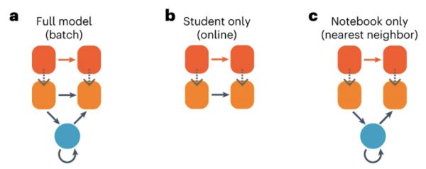 ▷ 图 7: 学习系统模型示意图,(a)使用学生-笔记本网络;(b)仅使用学生网络;(c)仅使用笔记本网络。图源:参考文献1