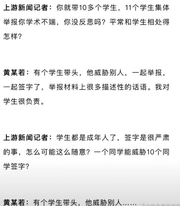 18日晚,黄某若本人接受上游新闻采访,他坚持自己不存在学术不端。手底下十几个学生就有11人站出来举报他的唯一理由是:有学生带头,并威胁了其他学生。