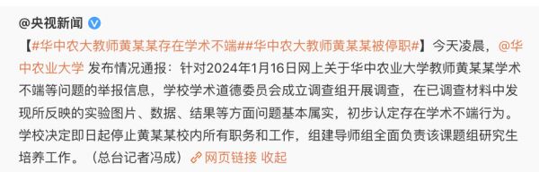 但打脸来得异常迅速,1月19日凌晨,华中农业大学官方调查已经出了初步结果。认定黄某若存在学术不端行为,即日起停止校内职务和工作。