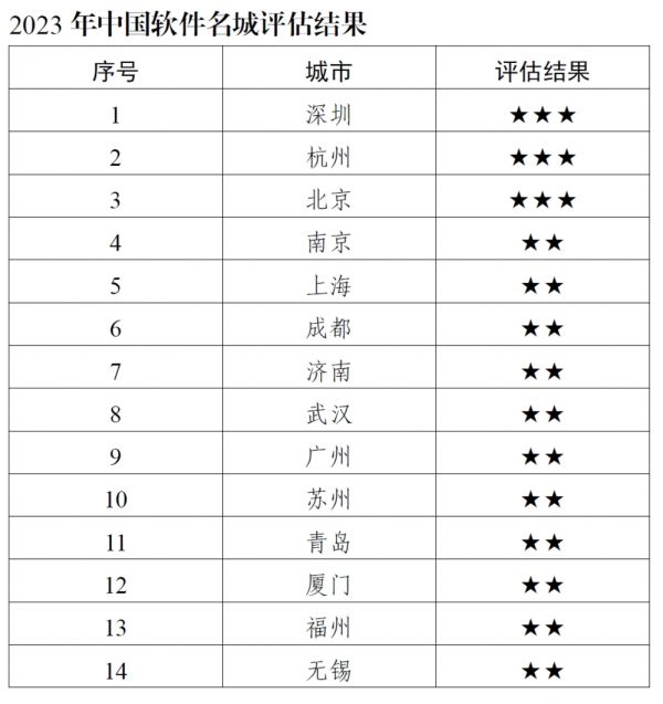 根据工信部发布的2023年中国软件名城,杭州位列第二,与深圳、杭州并列为三星级,而武汉位列第8,为两星级城市。