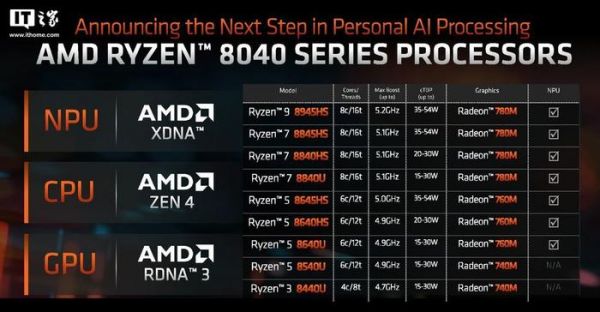 AMD 在上个月推出了锐龙 8040 系列 CPU,其中 R7 8840U 采用 8 核 16 线程,睿频 5.1GHz,配有 Radeon 780M 核显,可以看作是 R7 7840U 的马甲型号,只是 NPU 的 AI 性能更强一点,因此用于目前主推的 AI PC。