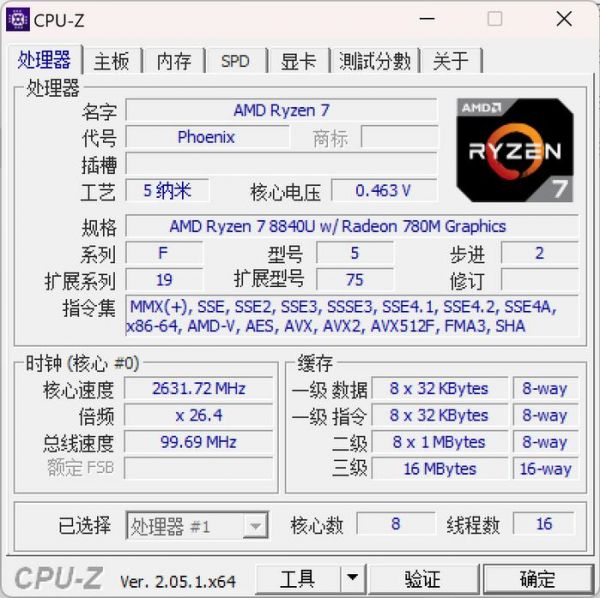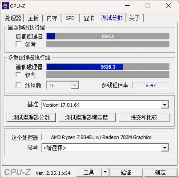 根据 GPD 官方给出的 CPU-Z 测试,8840U 和 7840U 版本掌机跑分基本一致,IT之家附截图如下:8840U 基准测试:版本 Version 17.01.64