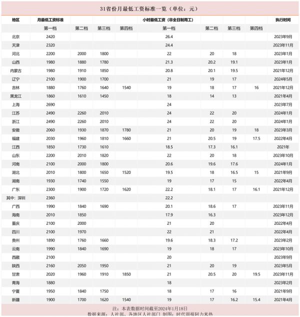 时代财经统计发现,2023年至今,已有北京、天津、河北、山西、上海、安徽、浙江、山东、湖北等19个省份上调了最低工资标准。