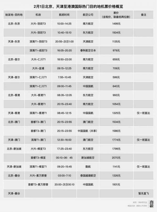 为了更直观呈现天津滨海有多便宜,在1月13日这天,“真故研究室”对比了2月1日分别从北京和天津出发,到国内和国际不同热门目的地的机票价格。普遍来看,的确天津出发的机票会更优惠些。尤其在部分热门国际线路,比如到日本、新加坡,天津出发的线路价格竞争力比较明显。