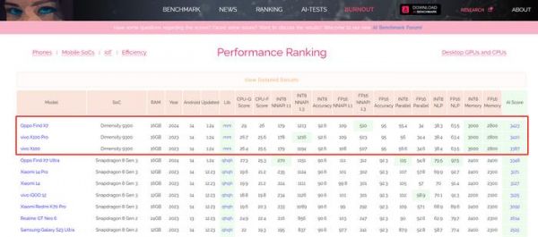 移动设备榜单中,排行前三的机型OPPO Find X7、vivo X100 Pro、vivo X100均搭载天玑9300,联发科实力霸榜。